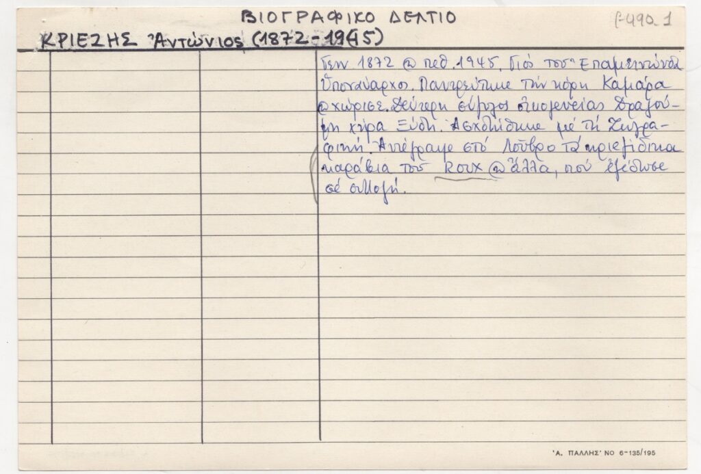 Βιογραφικό δελτίο, χειρόγραφο, χαρτόνι, 13,5×19,5 εκ., στα ελληνικά, του Αντώνη Κριεζή. Περιέχει συνοπτικές πληροφορίες για τον καλλιτέχνη.