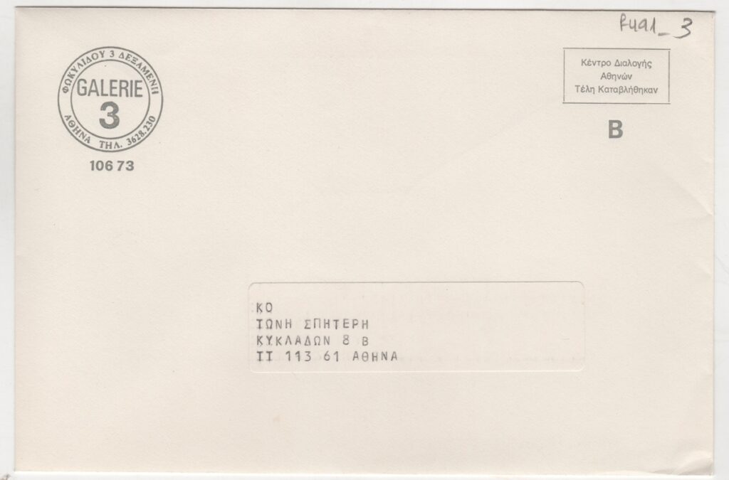 Φάκελος, χαρτί, 12,5×18,5 εκ., με αναγραφόμενα τα στοιχεία επικοινωνίας του Τώνη Σπητέρη. Περιέχει πρόσκληση εγκαινίων έκθεσης του Αλέκου Κτενά.