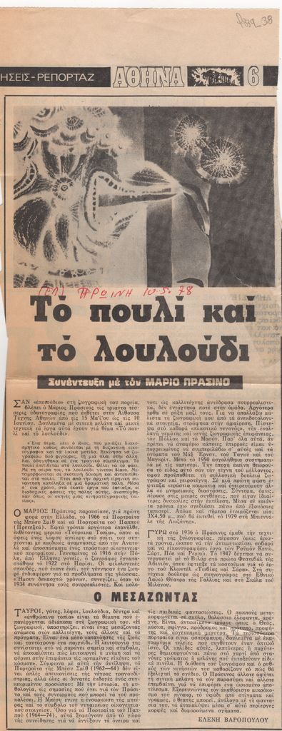 Απόκομμα, χαρτί, 37×15 εκ., στα ελληνικά, δημοσίευσης άρθρου για τον Μάριο Πράσινο και το εικαστικό του έργο, με αφορμή έκθεση του καλλιτέχνη με τίτλο “Το Παιδί και το Λουλούδι”, στην Αίθουσα Τέχνης Αθηνών. Επίσης, γίνεται αναφορά σε έκθεσή του στο Παρίσι αφιερωμένη στην τραγουδίστρια Μπέσι Σμιθ.