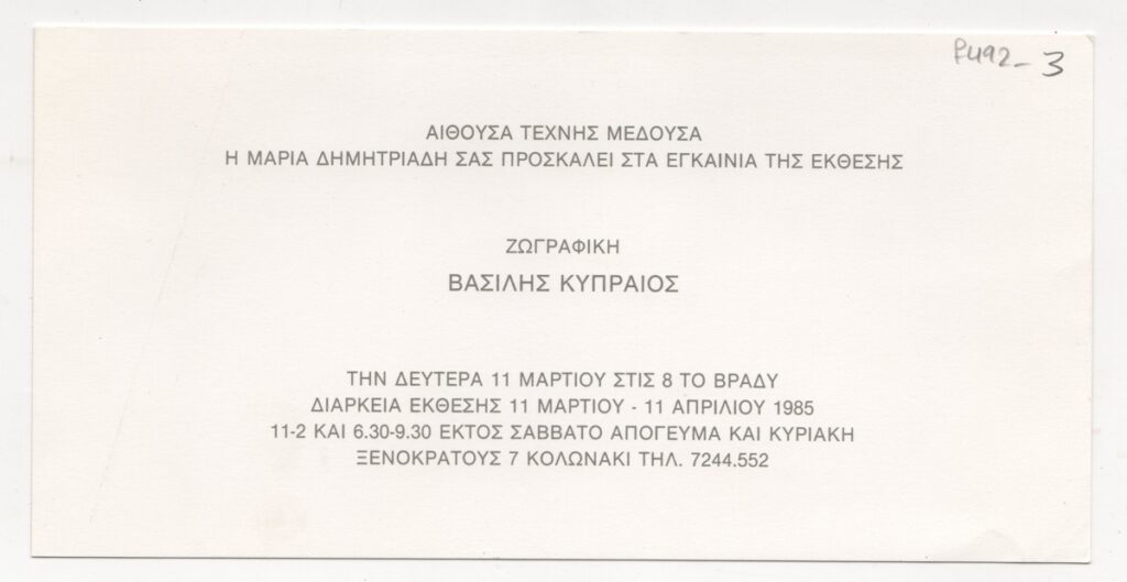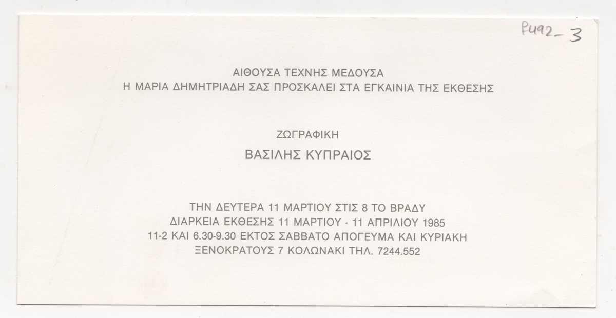 Πρόσκληση, χαρτόνι, 10×20 εκ., στα ελληνικά, εγκαινίων ατομικής έκθεσης ζωγραφικής του Βασίλη Κυπραίου.