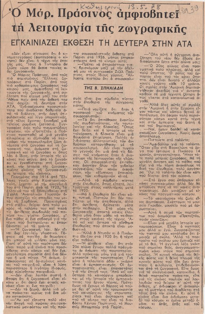 Απόκομμα, χαρτί, 24,5×15,5 εκ., στα ελληνικά, δημοσίευσης άρθρου για τον Μάριο Πράσινο, με αφορμή εγκαίνια επικείμενης έκθεσής του στην Αίθουσα Τέχνης Αθηνών.