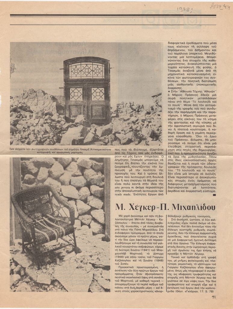 Απόκομμα, χαρτί, 30×23,5 εκ., στα ελληνικά, δημοσίευσης κριτικής για το έργο που παρουσιάζει ο Μάριος Πράσινος σε έκθεσή του στην Αίθουσα Τέχνης Αθηνών.