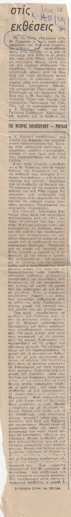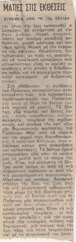 Απόκομμα, χαρτί, 2 φφ, 38×6,5 και 15.5×6 εκ., στα ελληνικά, δημοσίευσης κριτικής εκθέσεων του Μάριου Πράσινου που εξελίσσονται στο Γαλλικό Ινστιτούτο και στην γκαλερί Μέδουσα στην Αθήνα.