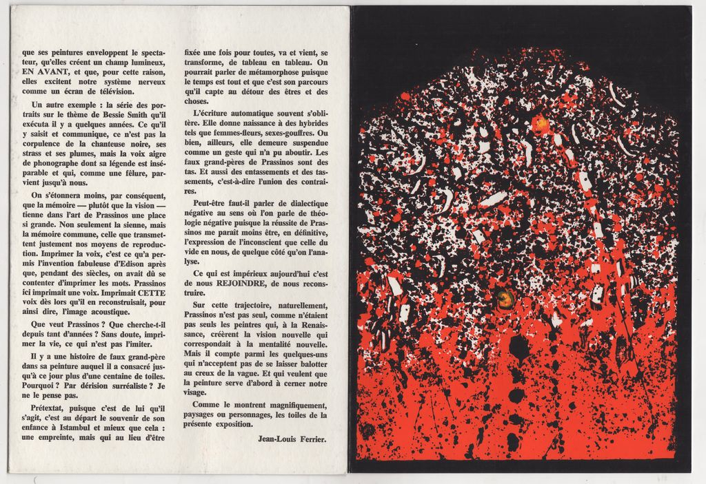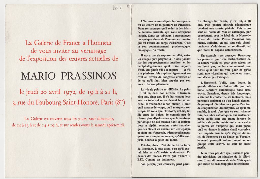 Πρόσκληση, χαρτόνι δίπτυχο, 22.5×16.5 εκ., στα γαλλικά, εγκαινίων έκθεσης του Μάριου Πράσινου στην Galerie de France στο Παρίσι. Περιέχει κείμενο για το έργο του καλλιτέχνη και εικονογράφηση.