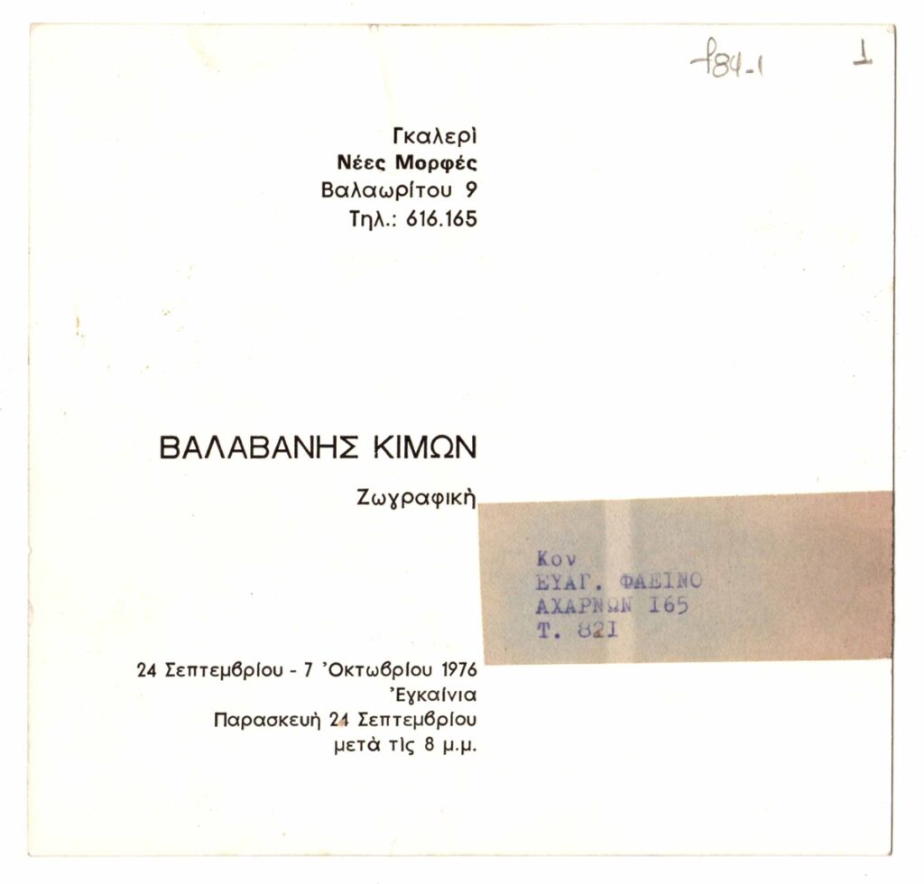 Πρόσκληση, χαρτόνι, 15×15.5 εκ., στα ελληνικά, εγκαινίων ατομικής έκθεσης του Κίμωνα Βαλαβάνη στην γκαλερί Νέες Μορφές στην Αθήνα. Η πρόσκληση εικονογραφείται και είναι απεσταλμένη προς τον Ευάγγελο Φαεινό.
