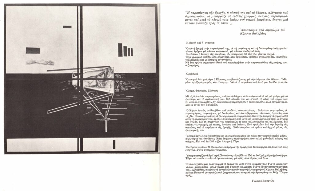 Έντυπο, χαρτόνι αναδιπλωμένο, 20×16 εκ., ατομικής έκθεσης του Κίμωνα Βαλαβάνη. Το έντυπο εικονογραφείται και περιέχει απόσπασμα κειμένου του καλλιτέχνη, κείμενο του Γιώργου Βακιρτζή και βιογραφικό του καλλιτέχνη.