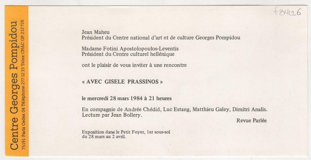 Πρόσκληση, χαρτόνι, 10.5×21 εκ., στα γαλλικά, σε εκδήλωση λογοτεχνικής συνάντησης με την Gisèle Πράσινου στο φουαγιέ του Centre Georges Pompidou στο Παρίσι.