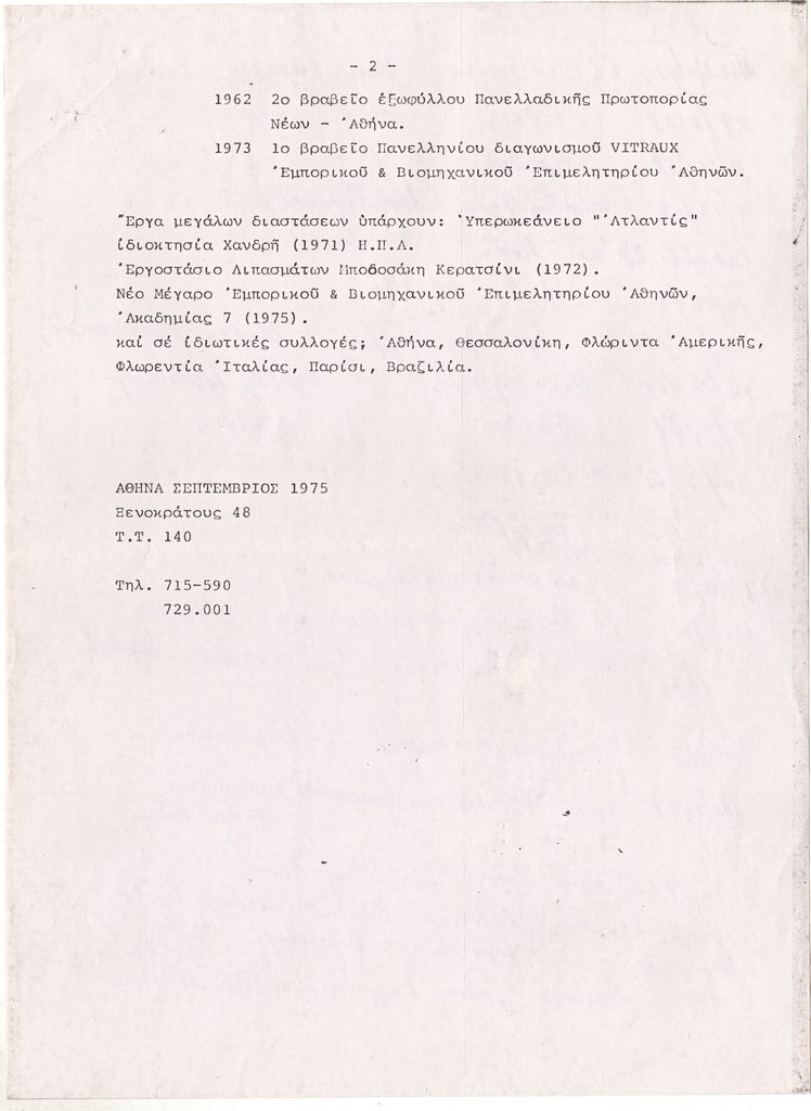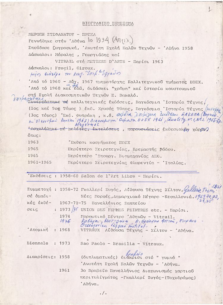 Φωτοαντίγραφο κειμένου, δακτυλόγραφο, με χειρόγραφες διορθώσεις και συμπληρώσεις, χαρτί, 2 φφ (το δεύτερο με 2 όψεις), 28,7×21,5 εκ. Βιογραφικό σημείωμα της Μερόπης Στεφανάτου-Πρέκα. Αναφέρονται σπουδές, ατομικές και ομαδικές εκθέσεις και φορείς που κατέχουν έργα της. Στην πίσω όψη της δεύτερης σελίδας, χειρόγραφος κατάλογος δημοσιευμάτων για το έργο της (περίοδος 1968-1975).