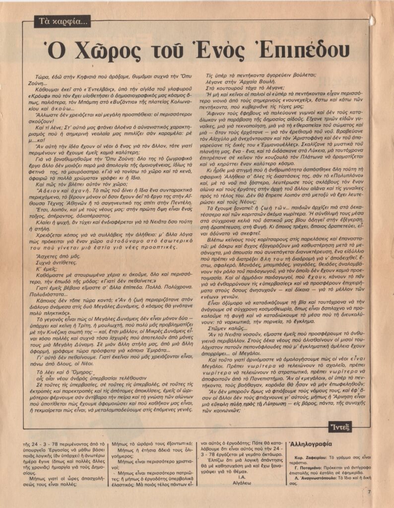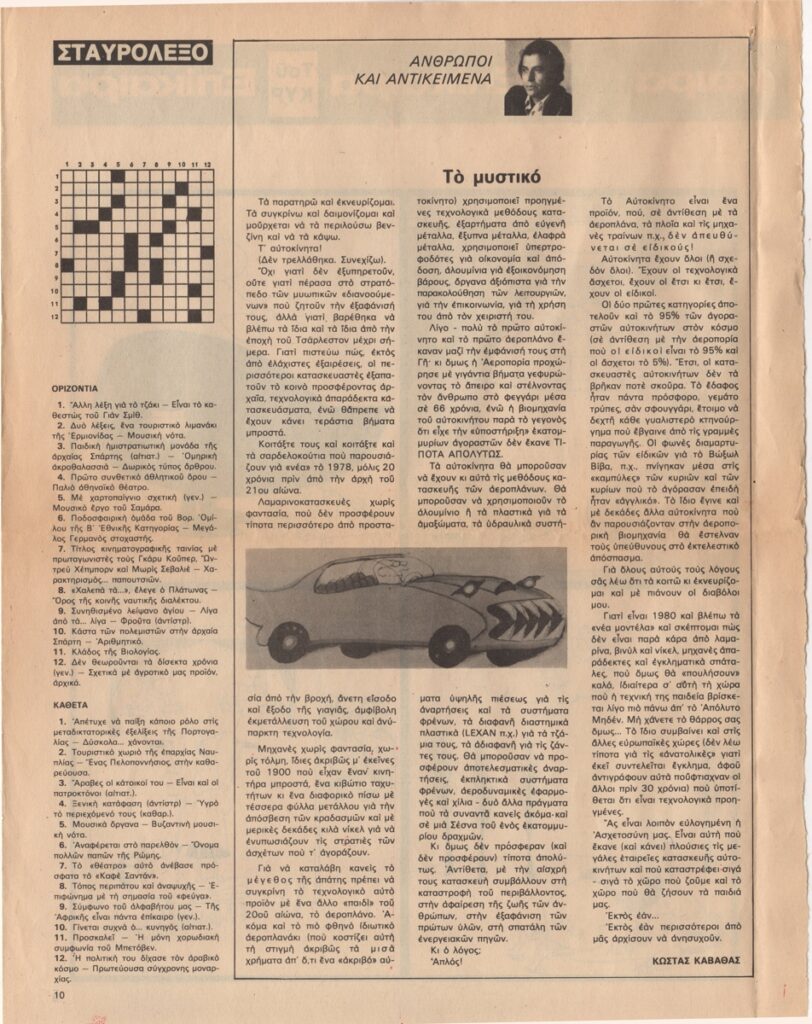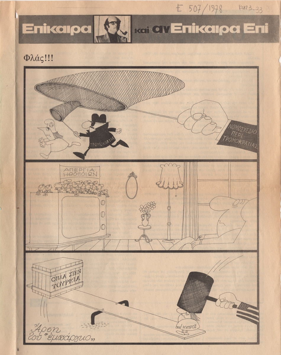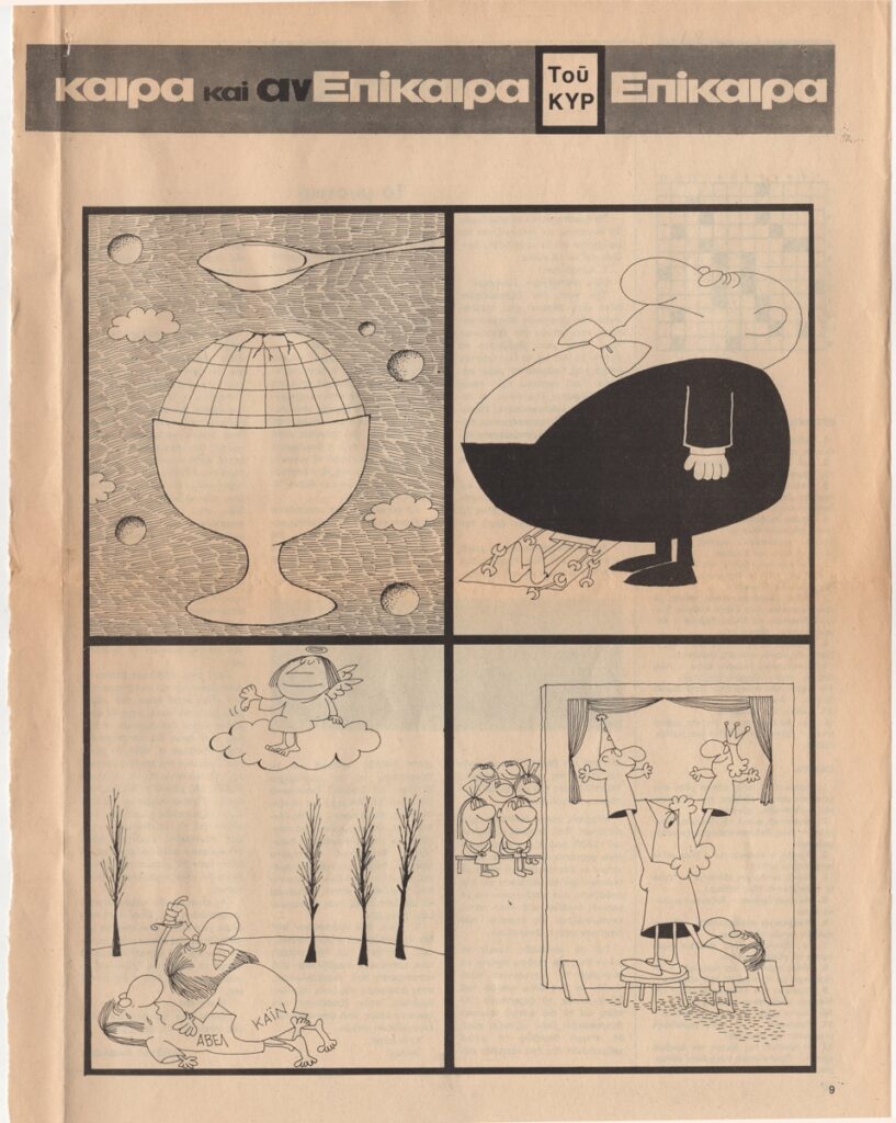 Απόκομμα, χαρτί, 2 φφ, 30×23.5 εκ., στα ελληνικά, δημοσίευσης γελοιογραφίας, α/μ, του ΚΥΡ (Γιάννη Κυριακόπουλου). Στο ίδιο, άρθρα με τίτλο “Ο χώρος του ενός επιπέδου” και “Άνθρωποι και Αντικείμενα. Το μυστικό”.