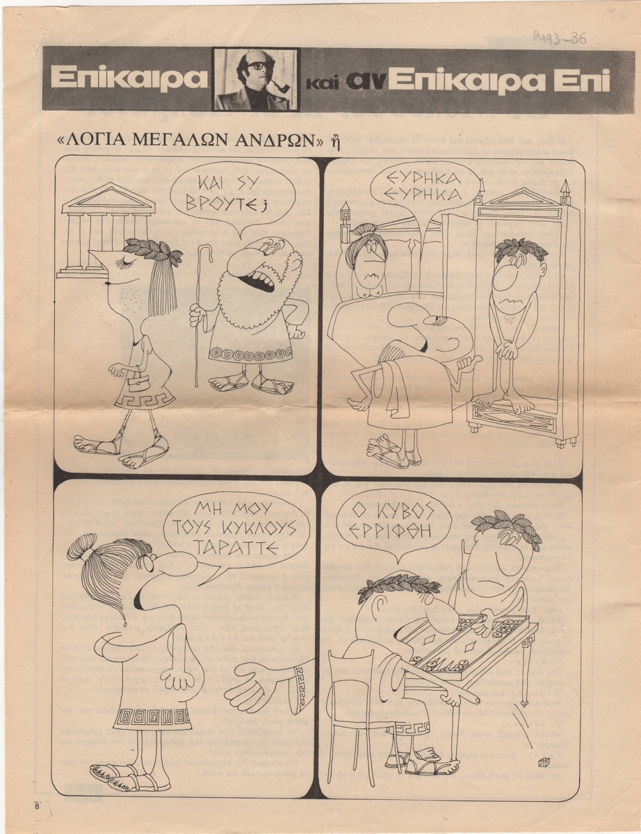 Απόκομμα, χαρτί, 2 φφ, 30×23.5 εκ., στα ελληνικά, δημοσίευσης γελοιογραφίας, α/μ, του ΚΥΡ (Γιάννη Κυριακόπουλου). Στο ίδιο, άρθρα με τίτλο “Οι Μολοσσοί κι οι Δαλματοί” και “Το Κρυφό Σχολειό”.