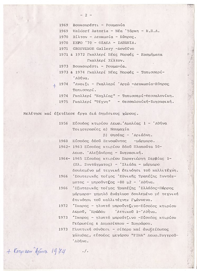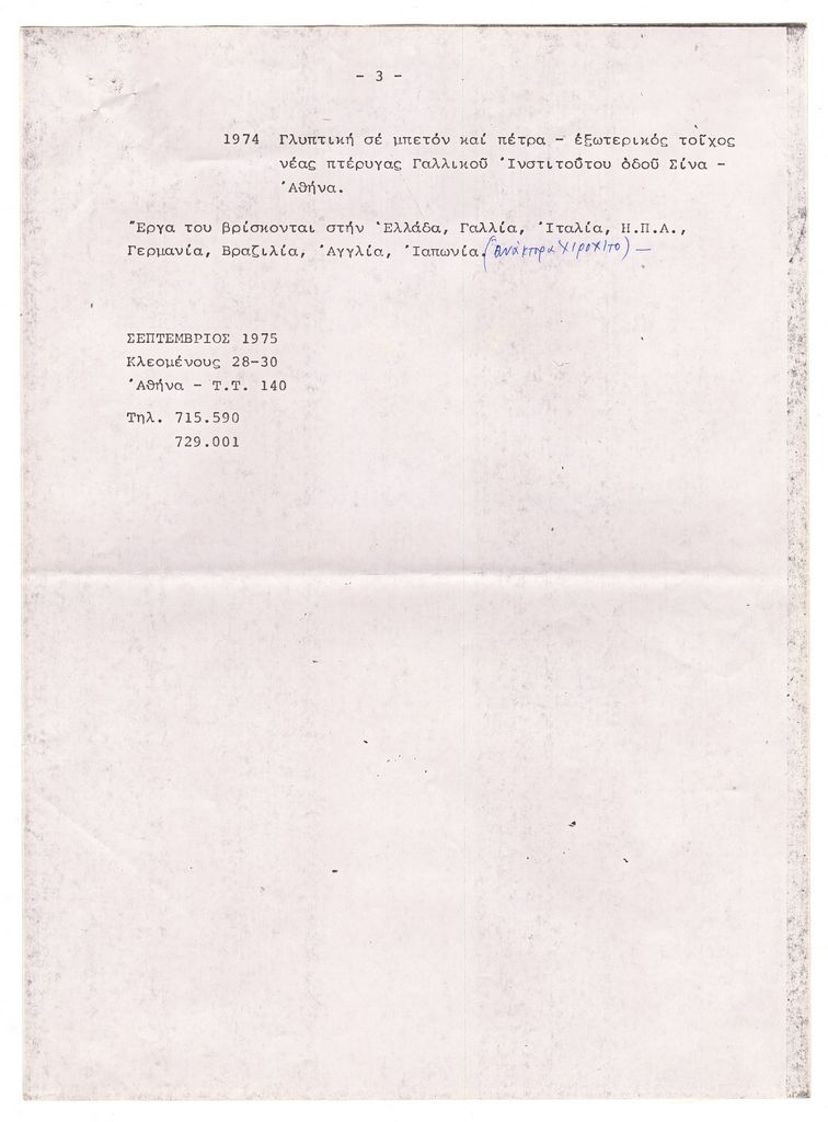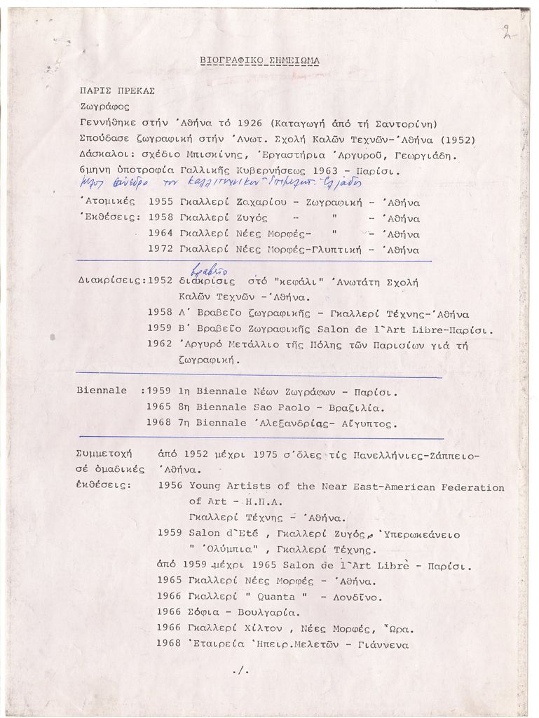 Φωτοαντίγραφο κειμένου, δακτυλόγραφο, με χειρόγραφες συμπληρώσεις, στα ελληνικά, χαρτί, 3 φφ, μίας όψης, 28,8×21,3 εκ. Βιογραφικό σημείωμα του Πάρη Πρέκα. Αναφέρονται σπουδές, ατομικές και ομαδικές εκθέσεις, διακρίσεις, συμμετοχή σε Biennale και έργα που δημιούργησε για δημόσιους χώρους.