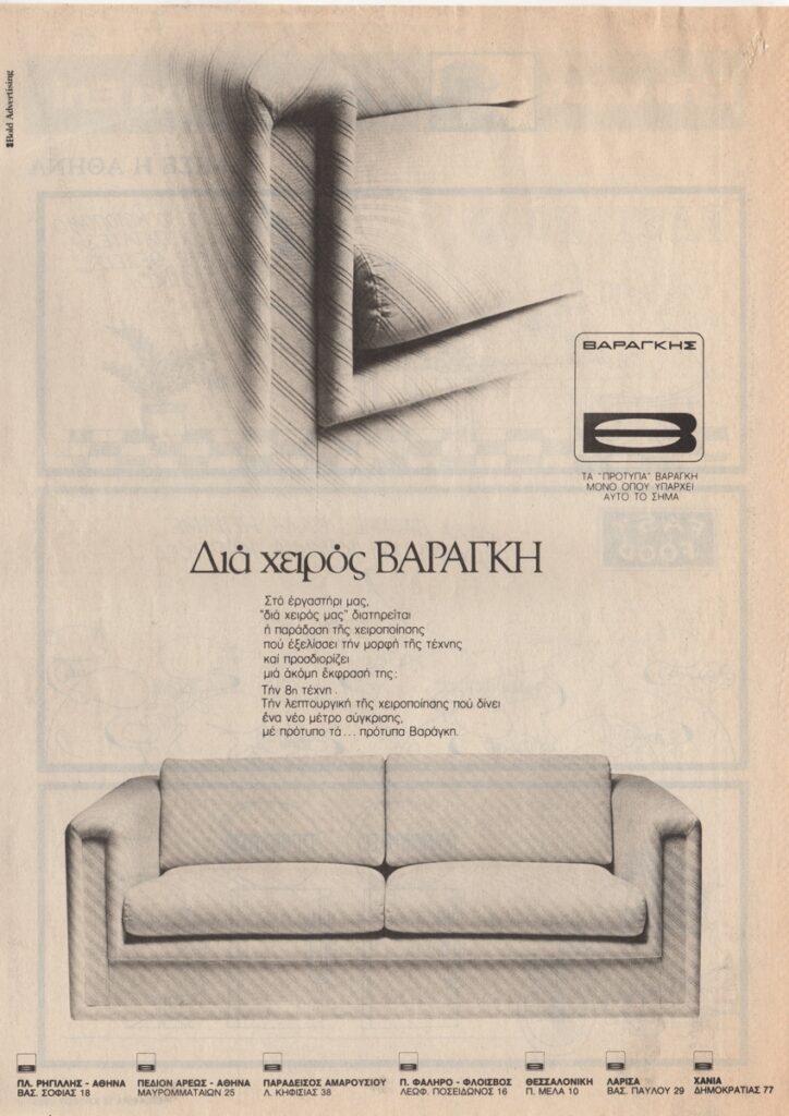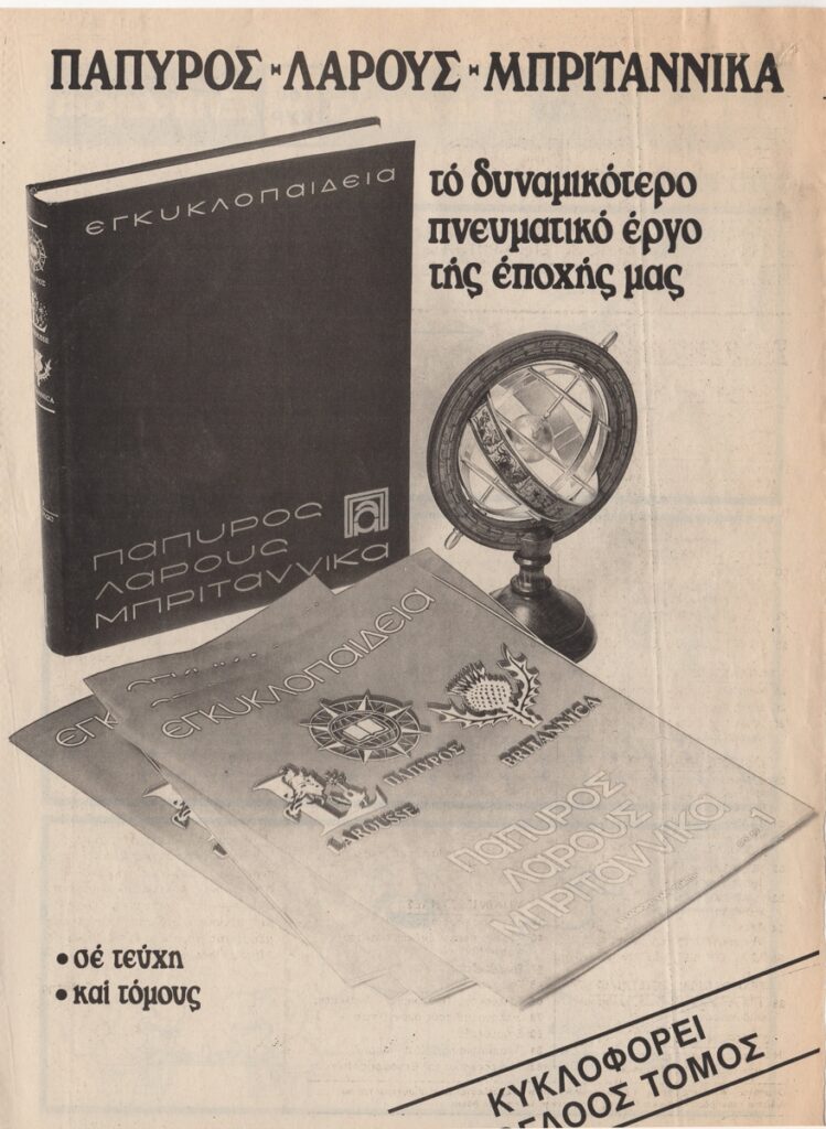 Απόκομμα, χαρτί, 2 φφ, 29×21 εκ., στα ελληνικά, δημοσίευσης γελοιογραφίας, α/μ, του ΚΥΡ (Γιάννη Κυριακόπουλου). Στο ίδιο, διαφήμιση: “Δια χειρός Βαράγκη” και “Πάπυρος Λαρούς Μπριτάνικα”.