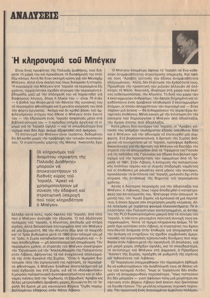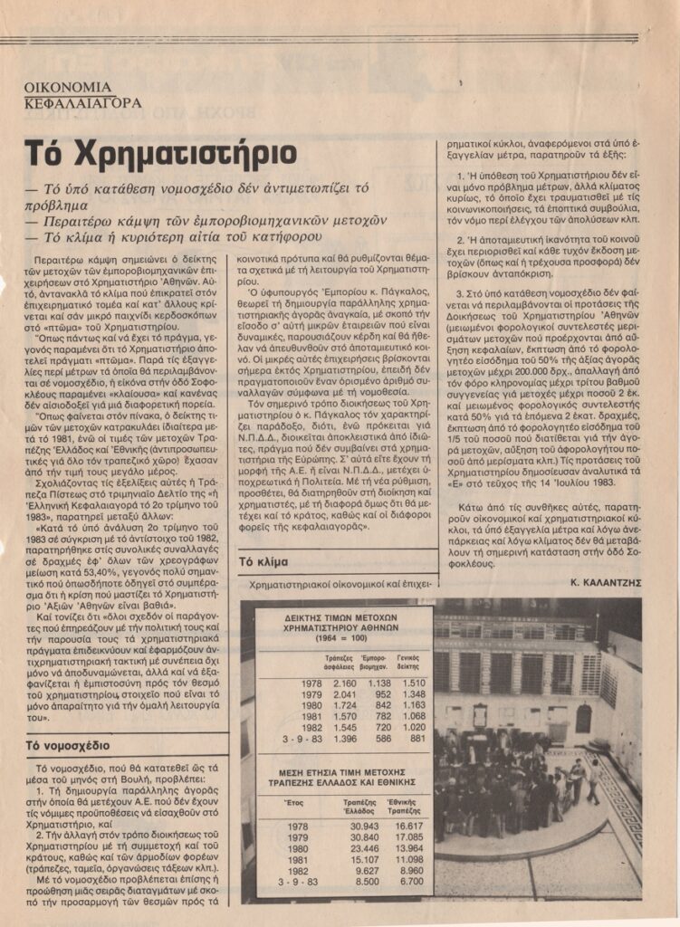 Απόκομμα, χαρτί, 2 φφ, 30×21 εκ., στα ελληνικά, δημοσίευσης γελοιογραφίας, α/μ, του ΚΥΡ (Γιάννη Κυριακόπουλου). Στο ίδιο, άρθρα με τίτλο “Το Χρηματιστήριο” και “Η κληρονομιά του Μπέγκιν”.