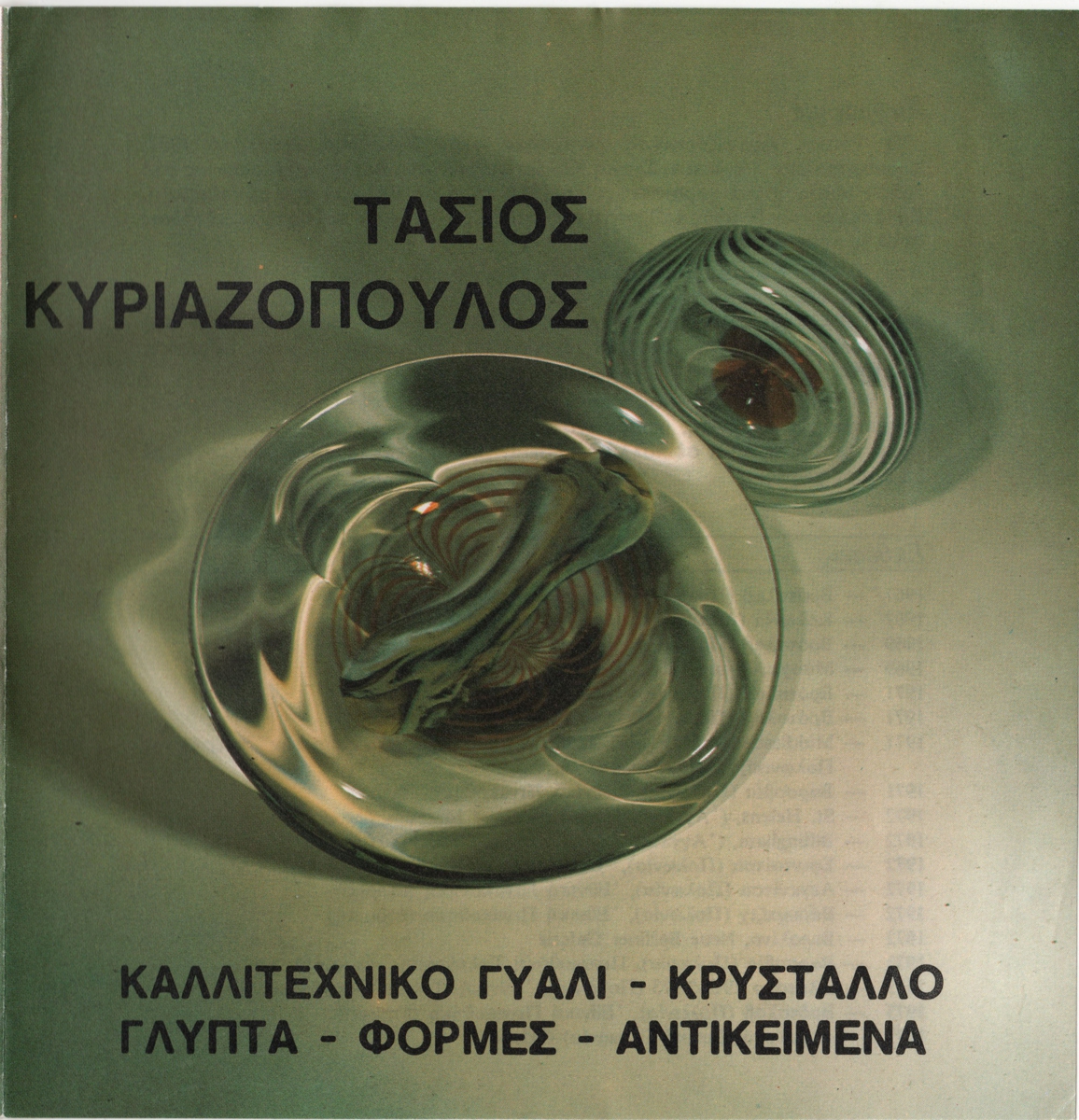 Έντυπο έκθεσης, στα ελληνικά, τρίπτυχο, χαρτί, 17,5×17,3 εκ. Έντυπο της ατομικής έκθεσης γλυπτικής σε γυαλί του Τάσιου Κυριαζόπουλου στην Αθήνα το 1983. Το έντυπο περιέχει σύντομο βιογραφικό καλλιτέχνη, κατάλογος εκθέσεων και συλλογές και μουσεία όπου φυλάσσονται έργα του. Επίσης, αποσπάσματα κριτικών του Χρύσανθου Χρήστου και του Σταύρου Σπύρογλου. Εικονογραφείται με αναπαραγωγές έργων. Ένθετο το έντυπο της πρόσκληση των εγκαινίων της έκθεσης.