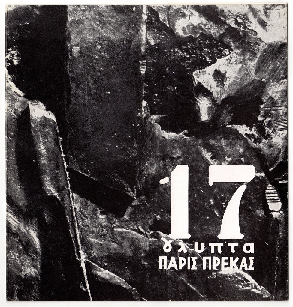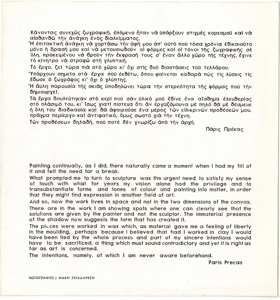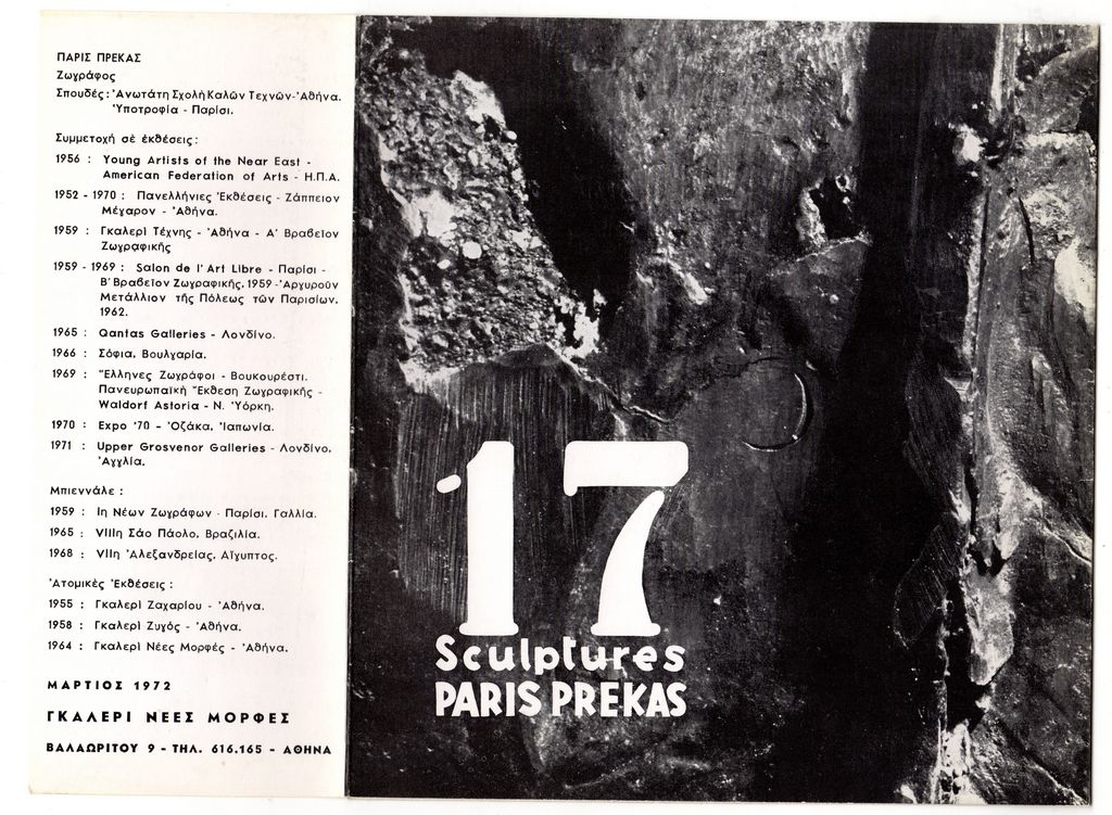 Έντυπο, στα ελληνικά και αγγλικά, τρίπτυχο, ιλουστρασιόν χαρτόνι, 19,7×18,8 εκ. Κατάλογος της ατομικής έκθεσης γλυπτικής του Πάρη Πρέκα στην στην Αθήνα το 1972. Περιέχει βιογραφικό και κείμενο του καλλιτέχνη.
