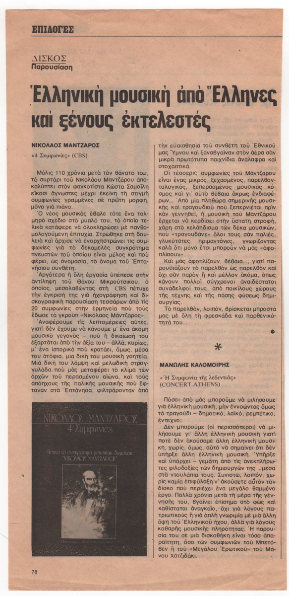 Απόκομμα περιοδικού, στα ελληνικά, χαρτί, 29,1×14,0 εκ. Παρουσίαση του δίσκου βινυλίου της ηχογράφησης τεσσάρων συμφωνιών του Νικολάου Μάντζαρου από το συγκρότημα μουσικής δωματίου “Νικόλαος Μάντζαρος” σε ενορχήστρωση από την εκδοχή για πιάνο για δεκαμελές συγκρότημα πνευστών του Κώστα Σαμοΐλη. Επίσης, απόσπασμα παρουσίασης της ηχογράφησης της “Συμφωνίας της Λεβεντιάς” του Μανόλη Καλομοίρη. Εικονογραφείται με αναπαραγωγή φωτογραφίας του εξωφύλλου του πρώτου δίσκου.