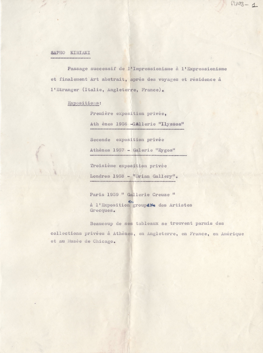 Κείμενο, δακτυλόγραφο, με χειρόγραφες διορθώσεις, στα γαλλικά, χαρτί, 28,8×21,3 εκ. Βιογραφικό της εικαστικού Σαπφούς Κυριάκη με αναφορά στις καλλιτεχνικές τάσεις που ακολούθησε στην πορεία του έργου της, κατάλογο εκθέσεων και αναφιορά στις συλλογές όπου ανήκουν έργα της.