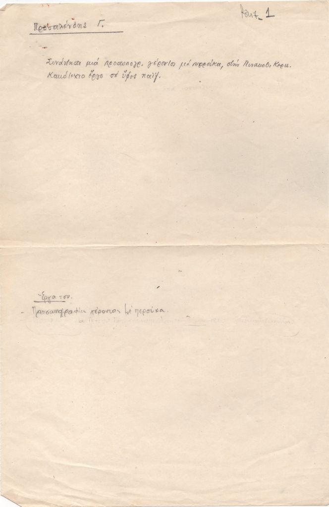 Κείμενο, χειρόγραφο, με μολύβι, στα ελληνικά, χαρτί, 29,8×19,4 εκ. Σημειώσεις σχετικά με προσωπογραφία ηλικιωμένου άνδρα, έργο του Γ. Προσαλέντη, που βρίσκεται στην Πινακοθήκη της Κέρκυρας.