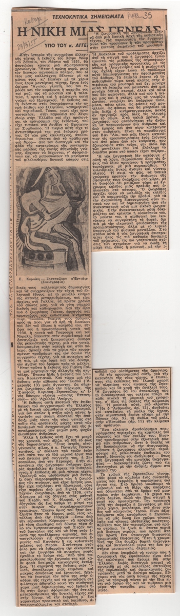 Απόκομμα εφημερίδας, στα ελληνικά, χαρτί, 39,0×10,4 εκ. Κριτική του Άγγελου Προκοπίου για την ομαδική έκθεση ζωγραφικής και γλυπτικής της Σαπφούς Κυριάκη και του Αχιλλέα Απέργη στην Αθήνα το 1955. Εικονογραφείται με αναπαραγωγή έργου της Σαπφούς Κυριάκη. Επάνω επιγραφή με τα στοιχεία δημοσίευσης.