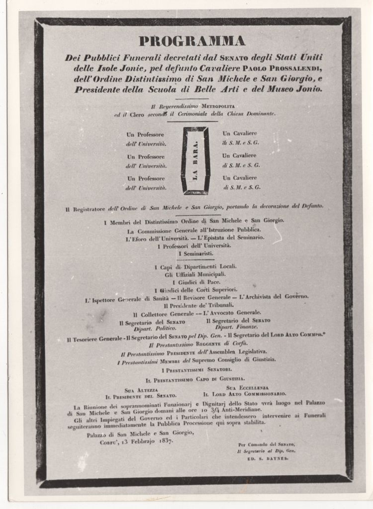 Φωτογραφία, α/μ, φωτογραφικό χαρτί, 17,8×13,0 εκ. Αναπαραγωγή του προγράμματος της δημόσιας νεκρώσιμης ακολουθίας του Παύλου Προσαλέντη του πρεσβύτερου, Κέρκυρα, 13/02/1837. Στην πίσω όψη, επιγραφές και σφραγίδα του φωτογράφου Γιώργου Δίπλα.
