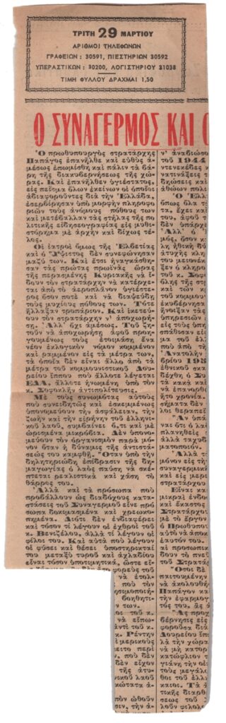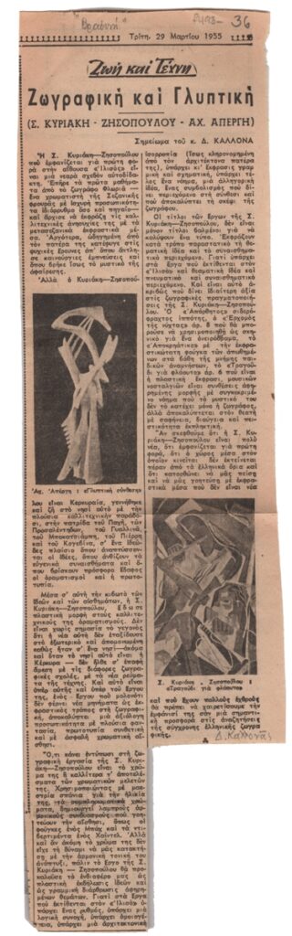 Απόκομμα εφημερίδας, στα ελληνικά, χαρτί, 34,5×9,8 εκ. Κριτική του Δ. Καλλονά για την ομαδική έκθεση ζωγραφικής και γλυπτικής της Σαπφούς Κυριάκη-Ζησοπούλου και του Αχιλλέα Απέργη στην Αθήνα το 1955. Εικονογραφείται με αναπαραγωγές έργων. Επιγραφές με τα στοιχεία δημοσίευσης και το όνομα του αρθρογράφου.