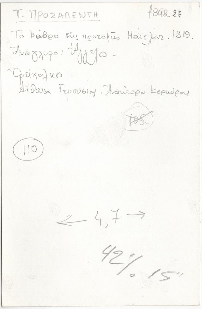 Φωτογραφία, α/μ, φωτογραφικό χαρτί, 17,2×11,3 εκ. Λεπτομέρεια του βάθρου της προτομής του Ύπατου Αρμοστή Ιονίων Νήσων Thomas Maitland (ορείχαλκος), που φιλοτέχνησε ο Παύλος Προσαλέντης ο πρεσβύτερος (1819) και βρίσκεται Αίθουσα Γερουσίας στα Ανάκτορα Κέρκυρας. Στην πίσω όψη, επιγραφή με τα στοιχεία του έργου και αρίθμηση.