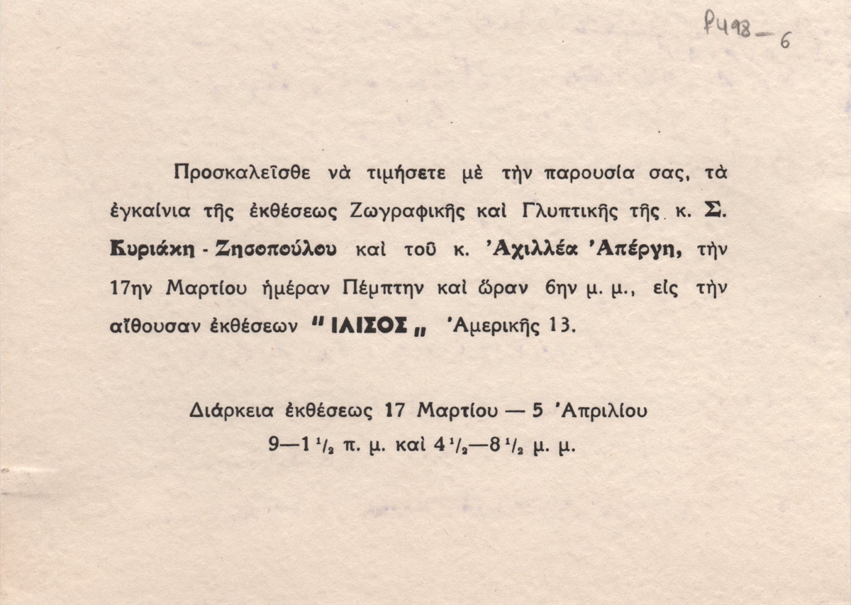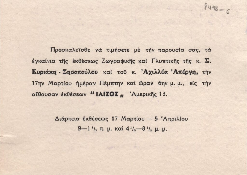 Έντυπο έκθεσης, στα ελληνικά, μονόφυλλο, χαρτόνι, 11,0×15,0 εκ. Πρόσκληση της κοινής έκθεσης ζωγραφικής και γλυπτικής της Σαπφούς Κυριάκη-Ζησοπούλου και του Αχιλλέα Απέργη στην Αθήνα το 1955.
