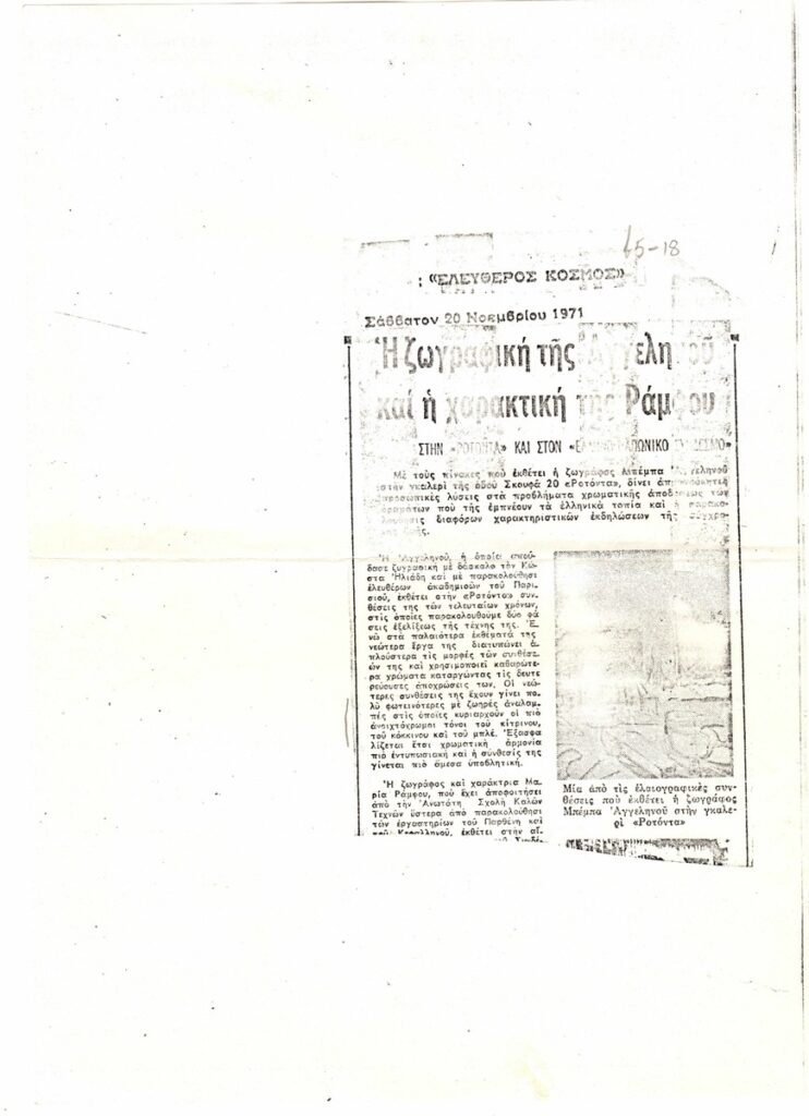Φωτοαντίγραφο αποκόμματος, χαρτί, 30×21εκ., στα ελληνικά,άρθρου το οποίο αναφέρεται σε ατομική έκθεση της Μπέμπας Αγγεληνού, στην γκαλερί Ροτόντα, στην Αθήνα, το 1971.