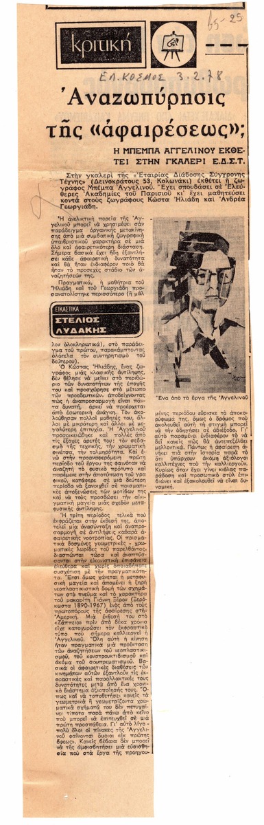 Απόκομμα, χαρτί, 40×11,5 εκ, στα ελληνικά, δημοσίευσης κριτικής έκθεσης της Μπέμπας Αγγεληνού, η οποία διεξάγεται στην Εταιρεία Διάδοσης Σύγχρονης Τέχνης στην Αθήνα.