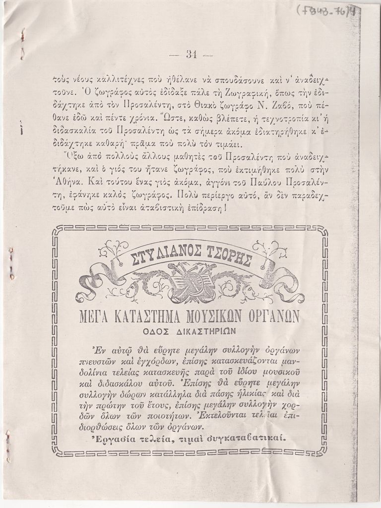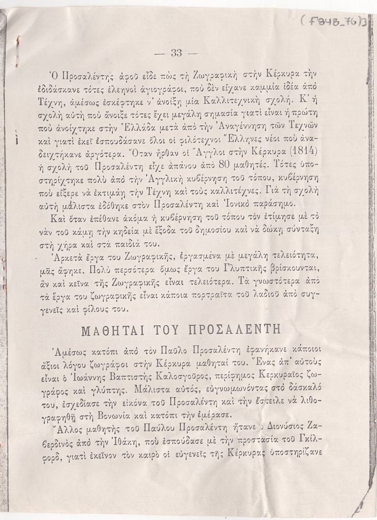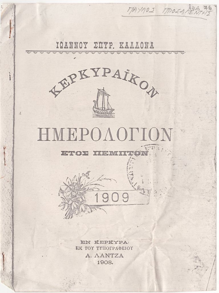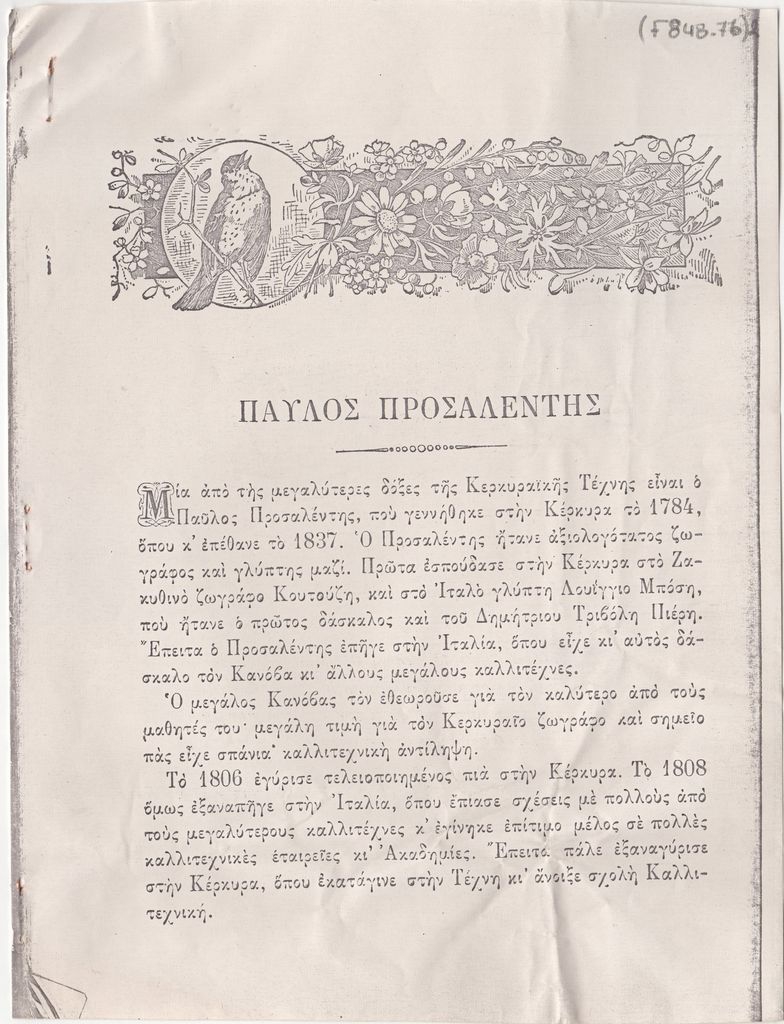 Φωτογραντίγραφο αποκόμματος, έντυπο, στα ελληνικά, χαρτί, 4 φφ., 20,7×15,5 εκ., από το ΚΕΡΚΥΡΑΪΚΟΝ ΗΜΕΡΟΛΟΓΙΟΝ (έτος Ε΄, 1909) του Ιωάννη Σπυρ. Καλλονά, όπου περιέχεται κείμενο για τον Παύλο Προσαλέντη τον πρεσβύτερο (4 φφ).