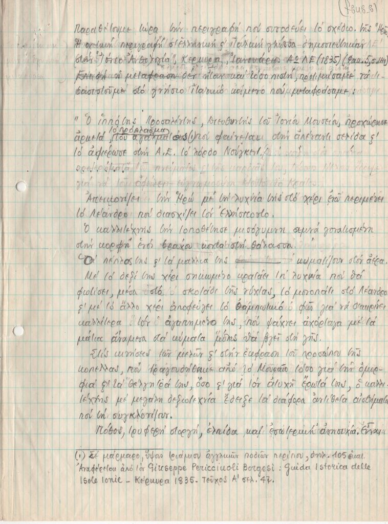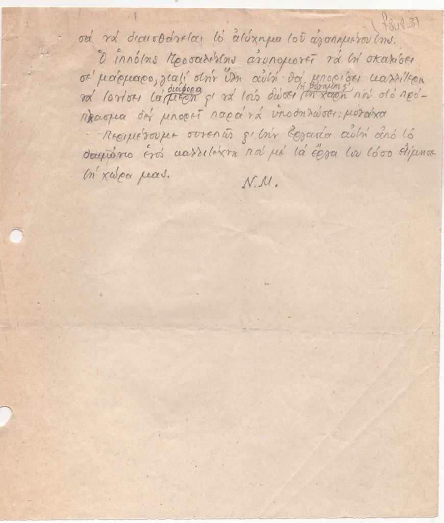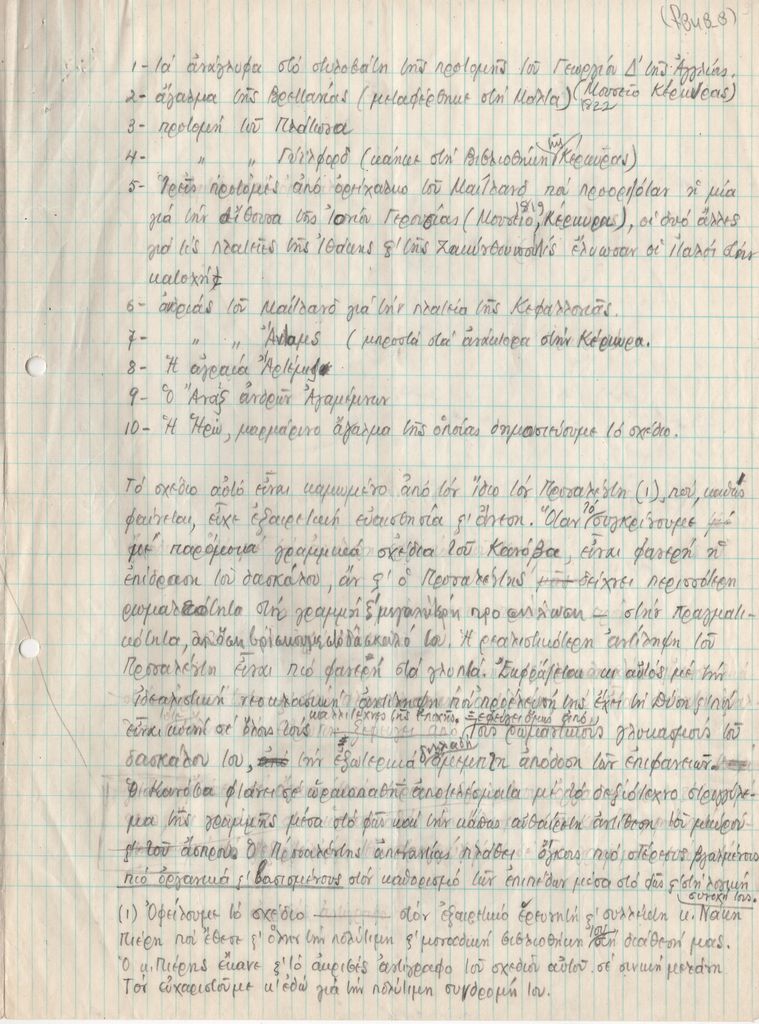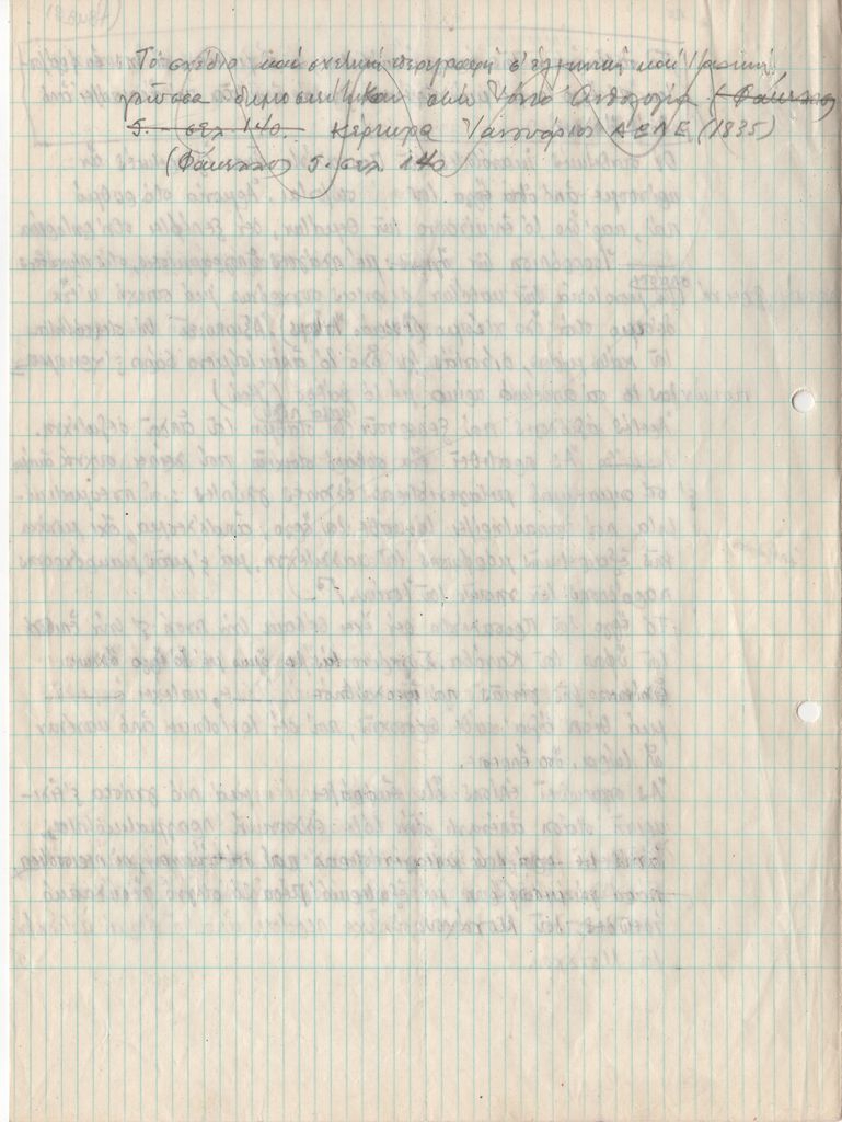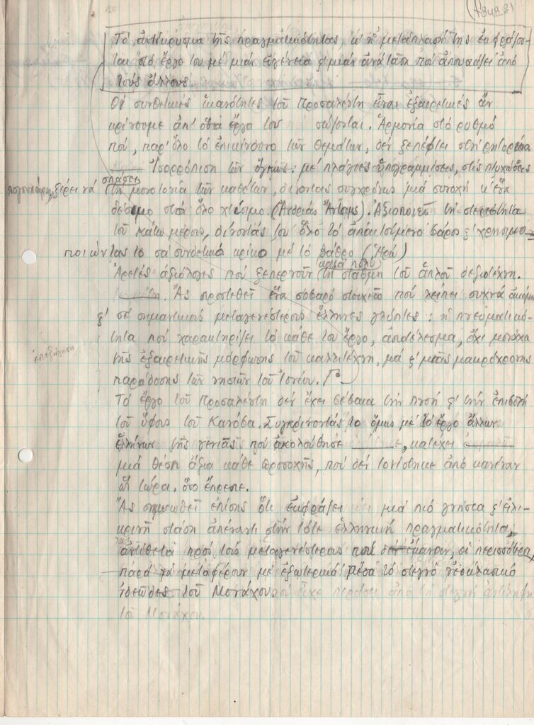 Κείμενο, χειρόγραφο, με μολύβι, 3 φφ (δίπτυχα), στα ελληνικά για το έργο του ζωγράφου και γλύπτη Παύλου Προσαλέντη του πρεσβύτερου με τίτλο “Ηρώ”. Το κείμενο υπογράφεται (;) από τον Ν.Μ. Σύμφωνα με το περιεχόμενό του το κείμενο έχει γραφτεί την περίοδο που ο Προσαλέντης είχε ολοκληρώσει το πρόπλασμα του έργου αλλά πριν την εκτέλεσή του σε μάρμαρο.