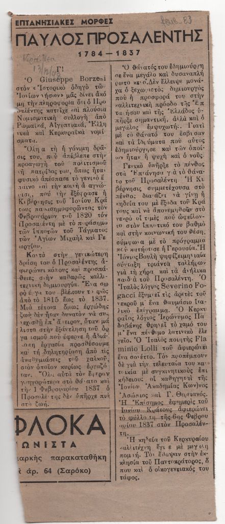 Απόκομμα, έντυπο, χαρτί, 25,6×10,5 εκ., όπου δημοσιεύεται, στα ελληνικά, το τρίτο μέρος άρθρου για τον γλύπτη Παύλο Προσαλέντη τον πρεσβύτερο. Επάνω, επιγραφή με τα στοιχεία της δημοσίευσης.