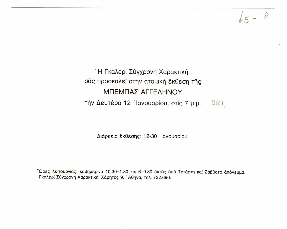 Πρόσκληση, χαρτόνι, 12×17 εκ., στα ελληνικά, εγκαινίων ατομικής έκθεσης της Μπέμπας Αγγεληνού, στην γκαλερί Σύγχρονη Χαρακτική, στην Αθήνα.