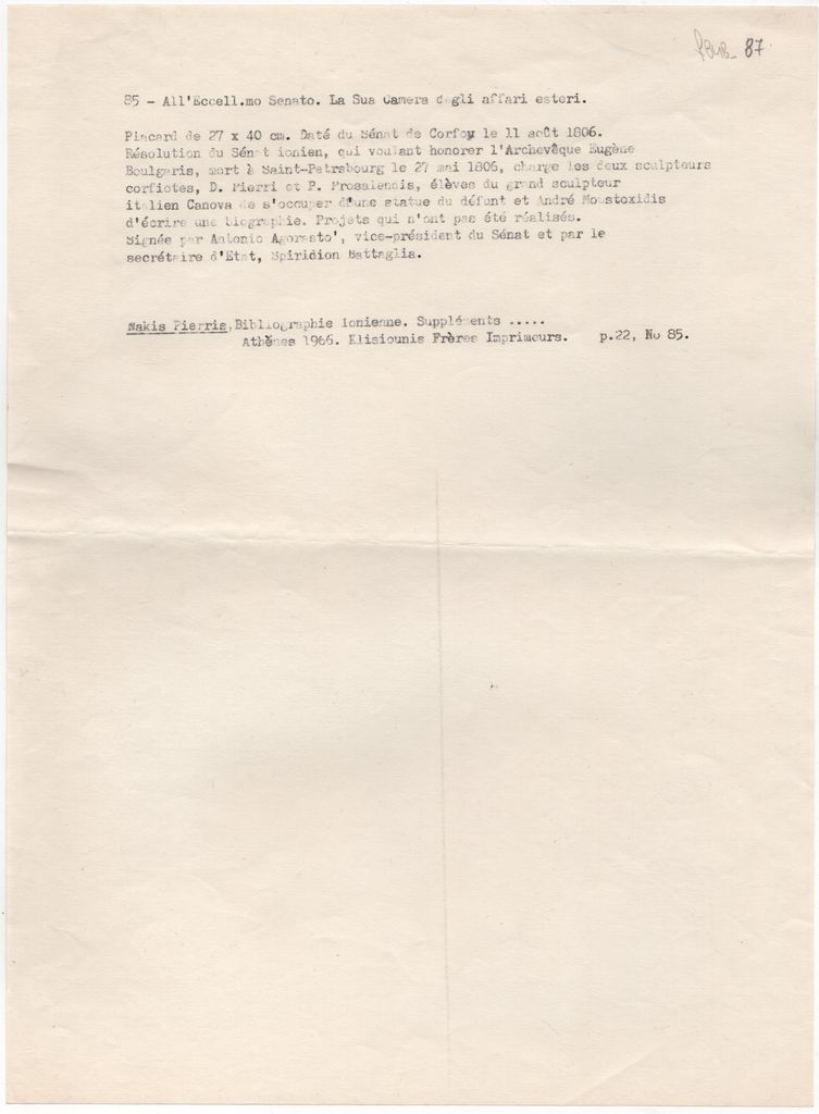Κείμενο, δακτυλόγραφη, στα γαλλικά, χαρτί, 29,0×21,2 εκ. Αποδελτίωση αποσπάσματος από το βιβλίο του Νάκη Πιέρρη “Bibliograpie Ionienne. Suppléments à la description raisonnée des ouvrages publies par les Grecs des Sept – Iles ou concernant ces iles du quinzième siecle à l’ année 1900 par Emile Legrand. Oeuvre pοsthume complétée et publiée par Hubert Pernot” (Αθήνα, 1966), που σχετίζεται με την ανάθεση στους Π. Προσαλέντη τον πρεσβύτερο και Δημήτριο Τριβώλη-Πιέρρη της προτομής του Ευγένιου Βούλγαρη.