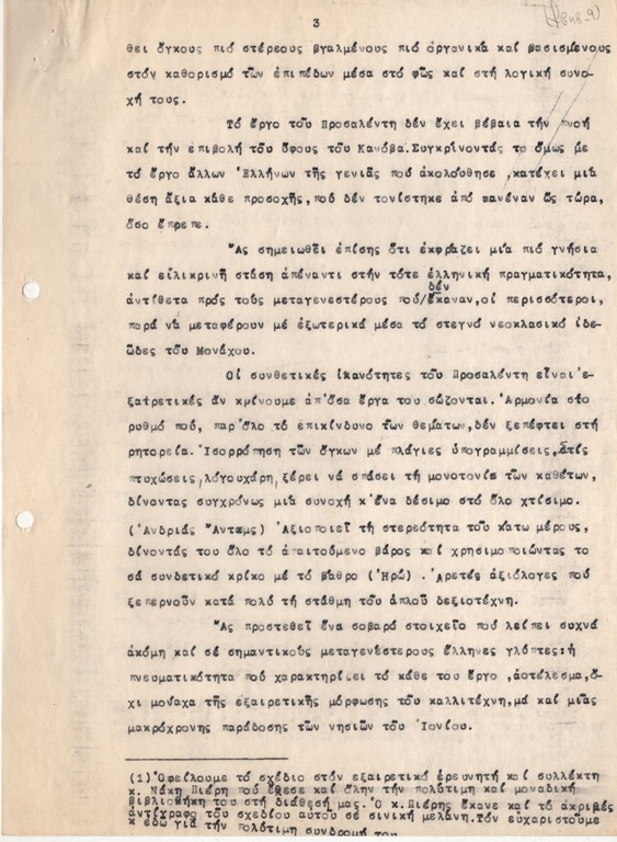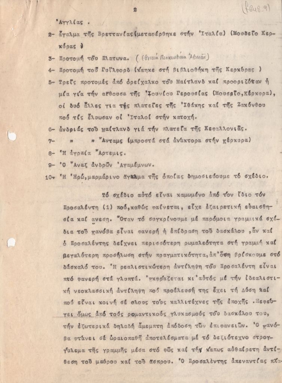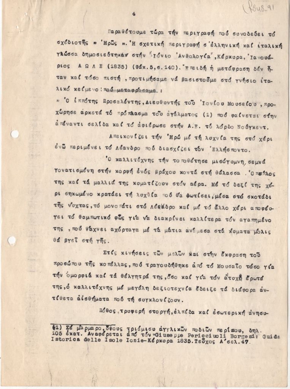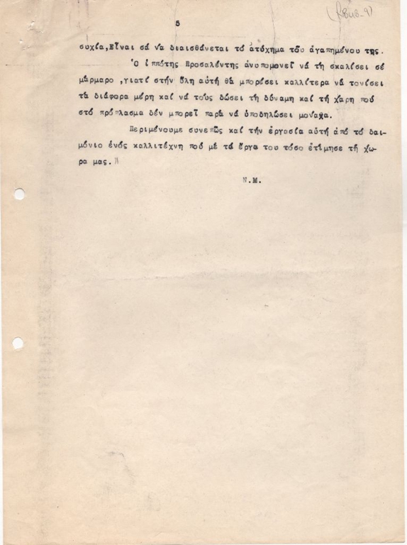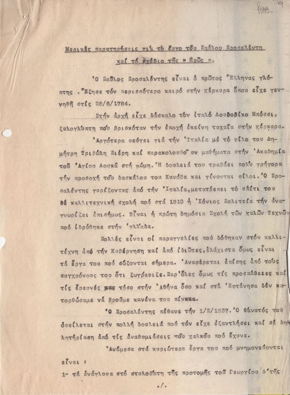 Κείμενο, δακτυλόγραφο, με χειρόγραφες σημειώσεις και διορθώσεις, στα ελληνικά, χαρτί, 5 φφ., 29,0×21,0 εκ. Πληροφορίες για το έργο του ζωγράφου και γλύπτη Παύλου Προσαλέντη του πρεσβύτερου με τίτλο “Ηρώ”. Το κείμενο υπογράφεται (;) από τον Ν.Μ. Σύμφωνα με το περιεχόμενό του το κείμενο έχει γραφτεί την περίοδο που ο Προσαλέντης είχε ολοκληρώσει το πρόπλασμα του έργου αλλά πριν την εκτέλεσή του σε μάρμαρο.