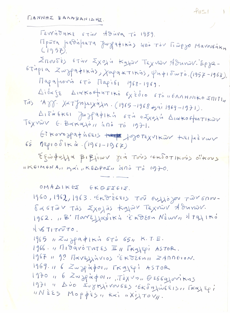 Βιογραφικό, χειρόγραφο με μπλε μελάνι, στα ελληνικά, 2 φφ, 28,5x 21 εκ., του Γιάννη Βαλαβανίδη. Περιλαμβάνει προσωπικά στοιχεία, λίστα ομαδικών και ατομικών εκθέσεών του.