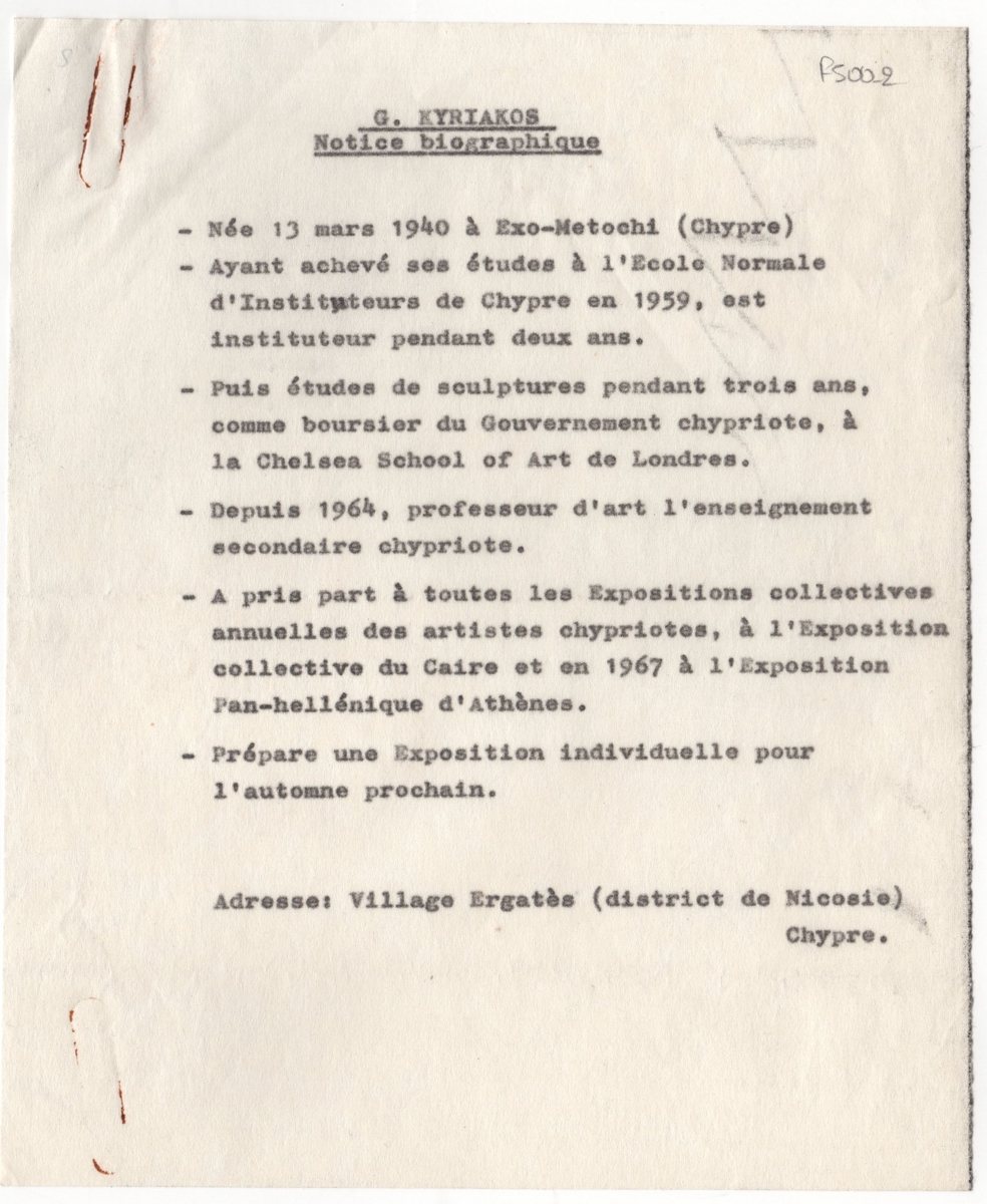 Κείμενο, δακτυλόγραφο, στα γαλλικά, χαρτί, 20,3×16,6 εκ. Βιογραφικό σημείωμα του γλύπτη Γιώργου Κυριάκου, με ιδιαίτερη αναφορά στις σπουδές, την επαγγελματική του πορεία και τις ατομικές του εκθέσεις.