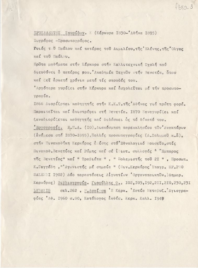 Κείμενο, δακτυλόγραφο, στα ελληνικά, χαρτί, 29,8×21,0 εκ. Σημειώσεις βιογραφικού του Σπυρίδωνα Προσαλέντη. Αναφέρονται σπουδές, επαγγελματική δραστηριότητα, εργογραφία και βιβλιογραφία.