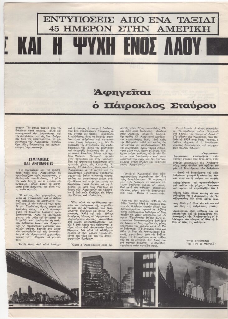 Απόκομμα περιοδικού, στα ελληνικά, χαρτί, 34,0×24,2 εκ. Απόσπασμα άρθρου του Πάτρουκλου Σταύρου με ταξιδιωτικές εντυπώσεις από οδοιπορικό του στην Αμερική. Εικονογραφείται με αναπαραγωγή φωτογραφιών από την Αμερική. Στο ίδιο τεκμήριο άρθρο του Γλαύκου Ξένου για τον Γιώργο Κυριάκου και άρθρο για κινηματογραφική ταινία για την ΕΟΚΑ.