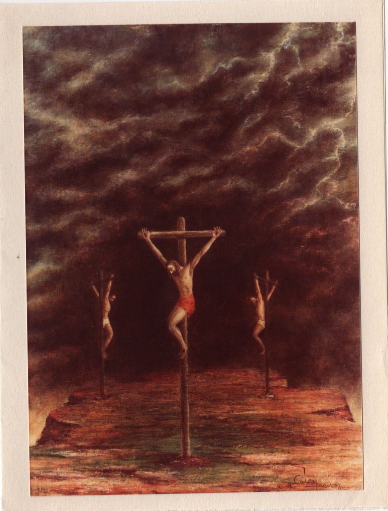 Φωτογραφία, έγχρωμη, φωτογραφικό χαρτί, 17,8×12,8 εκ., επικολλημένη στην εξωτερική όψη διπτύχου χαρτόνι, 19,3×14,8 εκ. Αναπαραγωγή του έργου του Σωτήρη Πυλαρινού «Και εγένετο σκότος». Εσωτερικά, επιγραφή με τα στοιχεία του έργου.