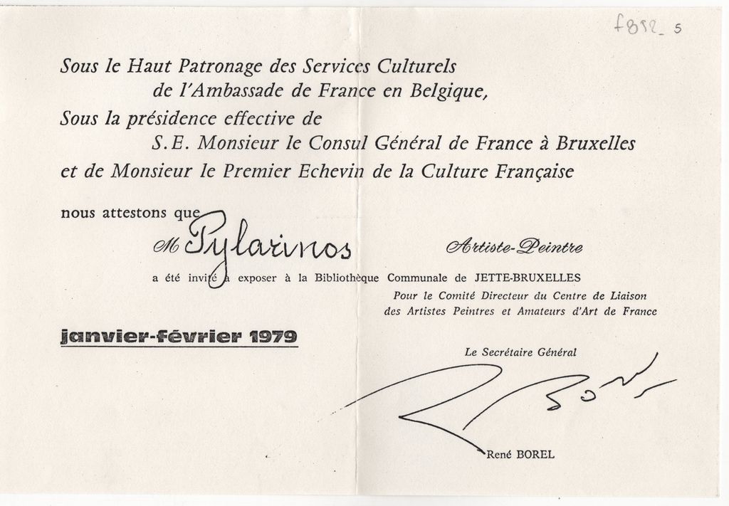 Φωτοαντίγραφο εντύπου, στα γαλλικά, χαρτί, 14,5×21,5 εκ. Βεβαίωση διοργάνωσης ατομικής έκθεσης ζωγραφικής του Σωτήρη Πυλαρινού στην Bibliothèque Communale de Jette-Bruxelles στις Βρυξέλλες το 1979.