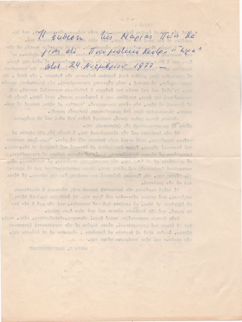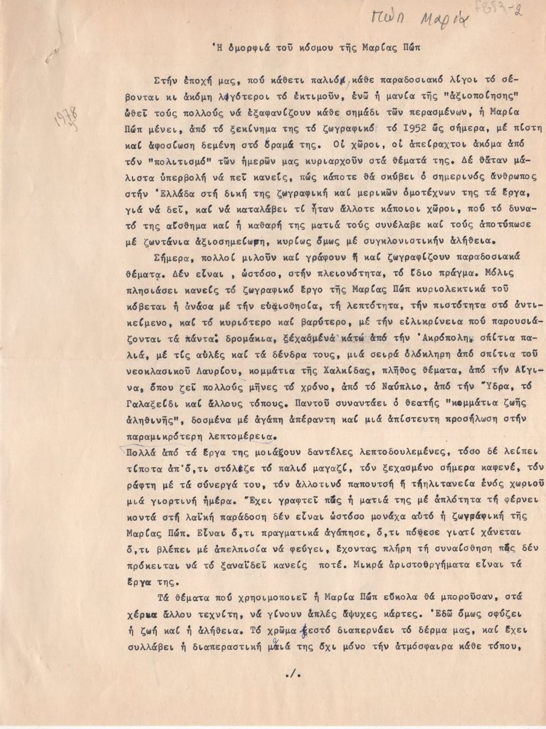 Κείμενο, δακτυλόγραφο με χειρόγραφες σημειώσεις, με μολύβι, στα ελληνικά, χαρτί, 2 φφ (η μία με δύο όψεις), 28,5×21,5 εκ. Κείμενο της Αθηνάς Γ. Καλογεροπούλου για το έργο της Μαρίας Πώπ.