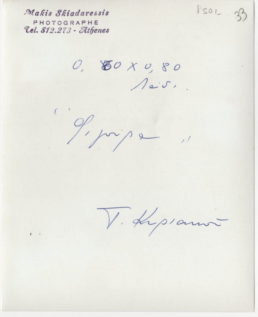 Φωτογραφία έργου, α/μ, σε φωτογραφικό χαρτί, 15,0×12,5 εκ. Στην πίσω όψη επιγραφή με τα στοιχεία του έργου και σφραγίδα φωτογράφου.