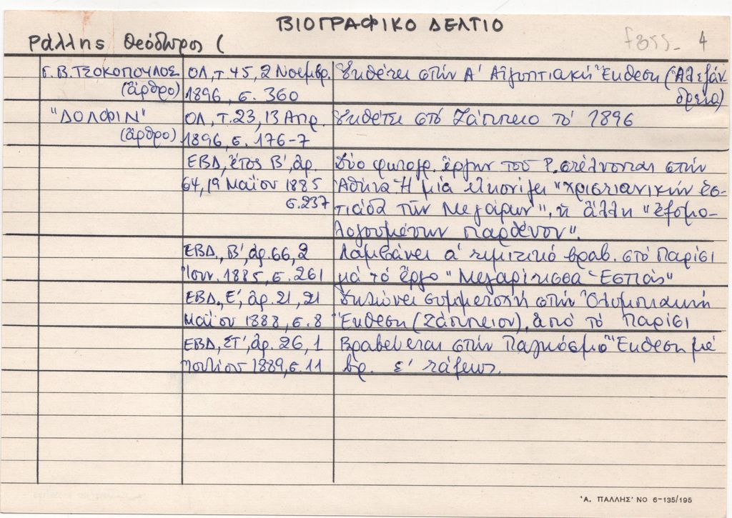Κείμενο, χειρόγραφο, με μπλε μελάνι, σε καρτέλα αποδελτίωσης, χαρτόνι, 13,7×10,8 εκ. Βιογραφικό δελτίο του Θεόδωρου Ράλλη με βιβλιογραφικές πηγές.
