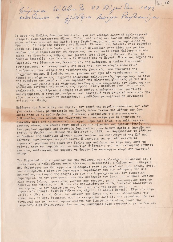 Κείμενο, δακτυλόγραφο, στα ελληνικά, χαρτί, 2 φφ., 29,8×21,0 εκ. Κείμενο του Εμμανουήλ Μαυρομμάτη για την Μπέλλα Ραφτοπούλου με αφορμή τον θάνατό της το 1992. Επάνω, επιγραφή με τον τίτλο του κειμένου.