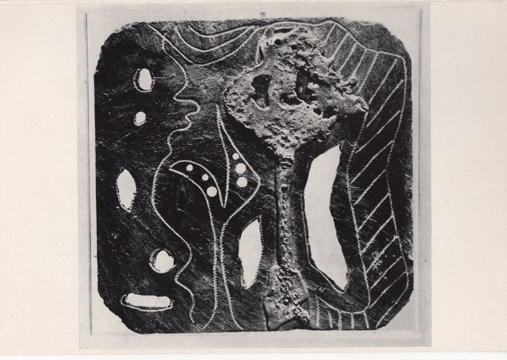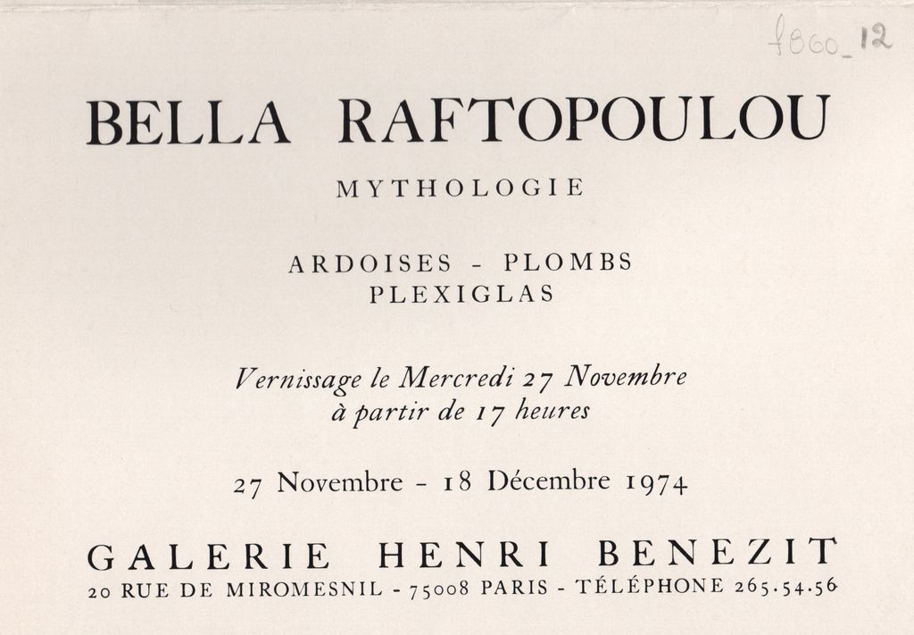 Έντυπο, στα γαλλικά, δίπτυχο, χαρτόνι ιλουστρατιόν, δύο όψεις, 11,5×16,8 εκ. Πρόσκληση εγκαινίων της ατομικής έκθεσης της Μπέλλας Ραφτοπούλου με τίτλο “ Mythologie. Ardoises – Plombs – Plexiglas” στο Παρίσι το 1974.