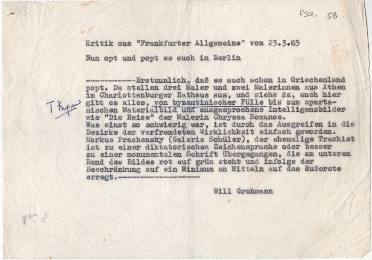 Κείμενο, δακτυλόγραφο, στα γερμανικά, χαρτί, 15,0×21,0 εκ. Αποδελτίωση κριτικής από τον γερμανικό τύπο για την ομαδική έκθεση των καλλιτεχνών της Ομάδας Άργος στη Γερμανία το 1965.