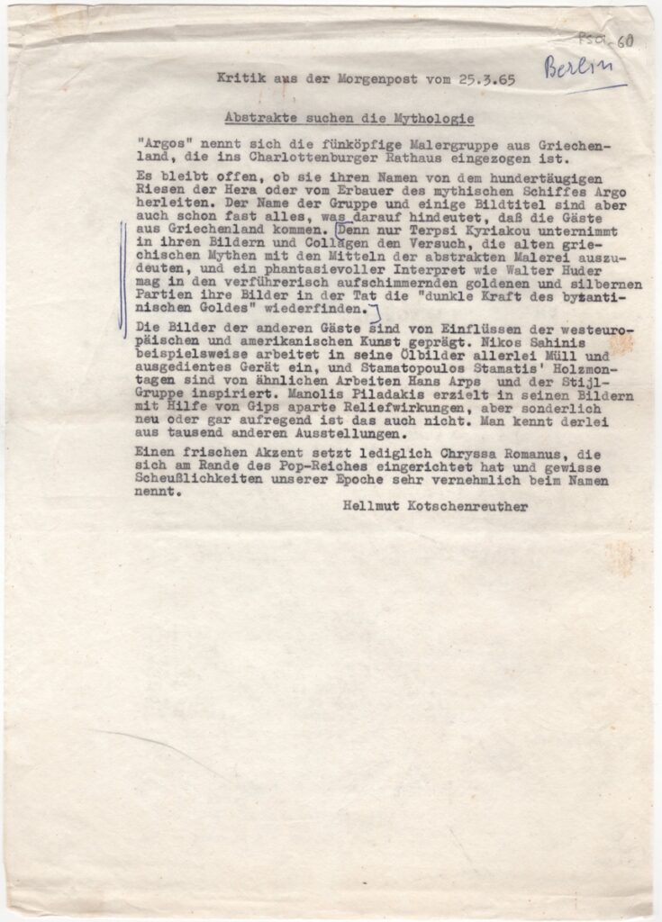 Κείμενο, δακτυλόγραφο, στα γερμανικά, χαρτί, 29,5×21,0 εκ. Αποδελτίωση κριτικής του Hellmut Kotschenreuther για την ομαδική έκθεση καλλιτεχνών της Ομάδας “Άργος” στη Γερμανία το 1965. Επάνω, επιγραφή.