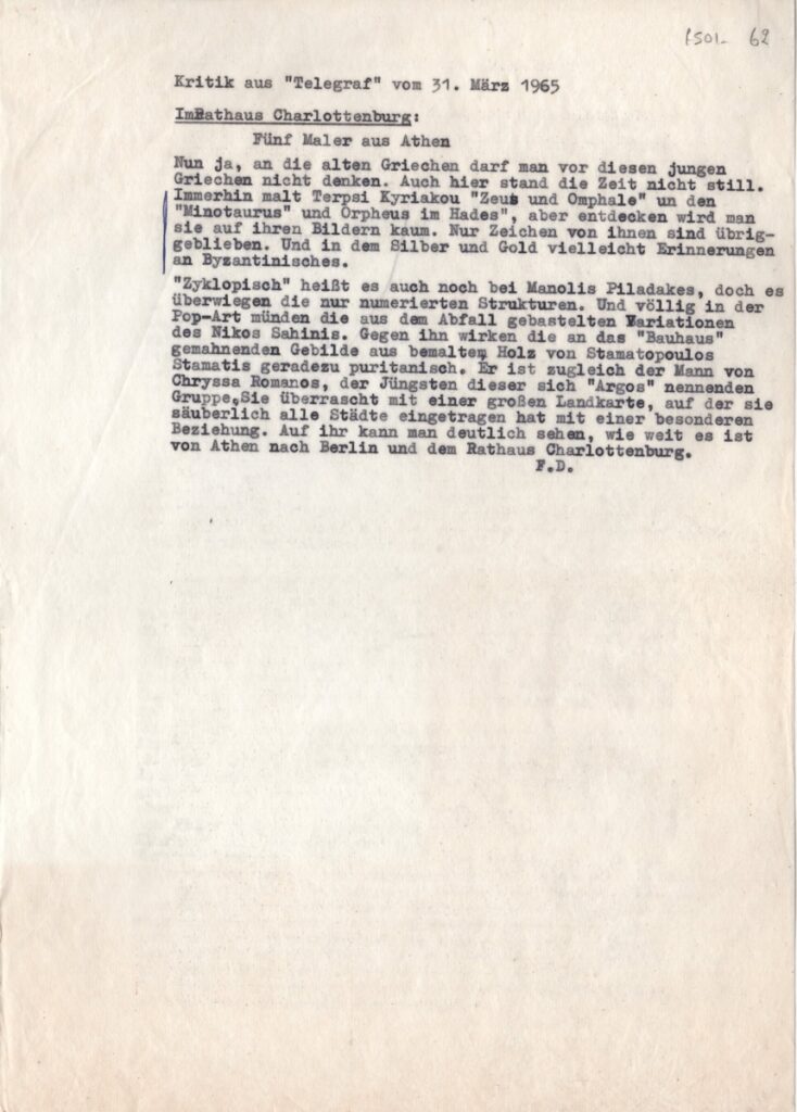 Κείμενο, δακτυλόγραφο, στα γερμανικά, χαρτί, 29,6×21,0 εκ. Αποδελτίωση κριτικής της ομαδικής έκθεσης καλλιτεχνών της Ομάδας Άργος στη Γερμανία το 1965.