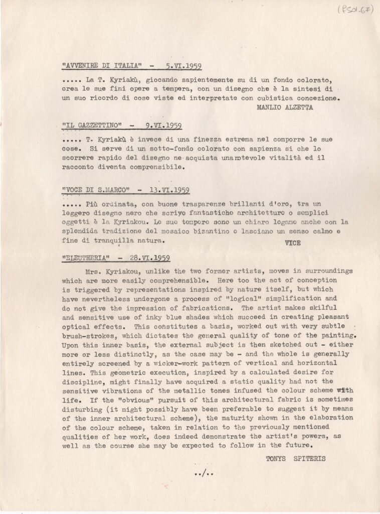 Κείμενο, δακτυλόγραφο, στα αγγλικά, χαρτί, 28,8×21,3 εκ. Αποδελτιώσεις κριτικών για το έργο της Τέρψης Κυριακού από τον ελληνικό τύπο. Περιλαμβάνονται αποσπάσματα κριτικών της Ε. Βακαλό, του Τ. Σπητέρη, M. Alzetta, Α. Δόξα, Μ. Καλλιγά, Σπ. Παναγιωτόπουλος, Α. Προκοπίου, T. Brajovic, Dr. Djordjevic, Ε. Φερεντίνου, Μ. Ανδρόνικου και Στ. Σπύρογλου.